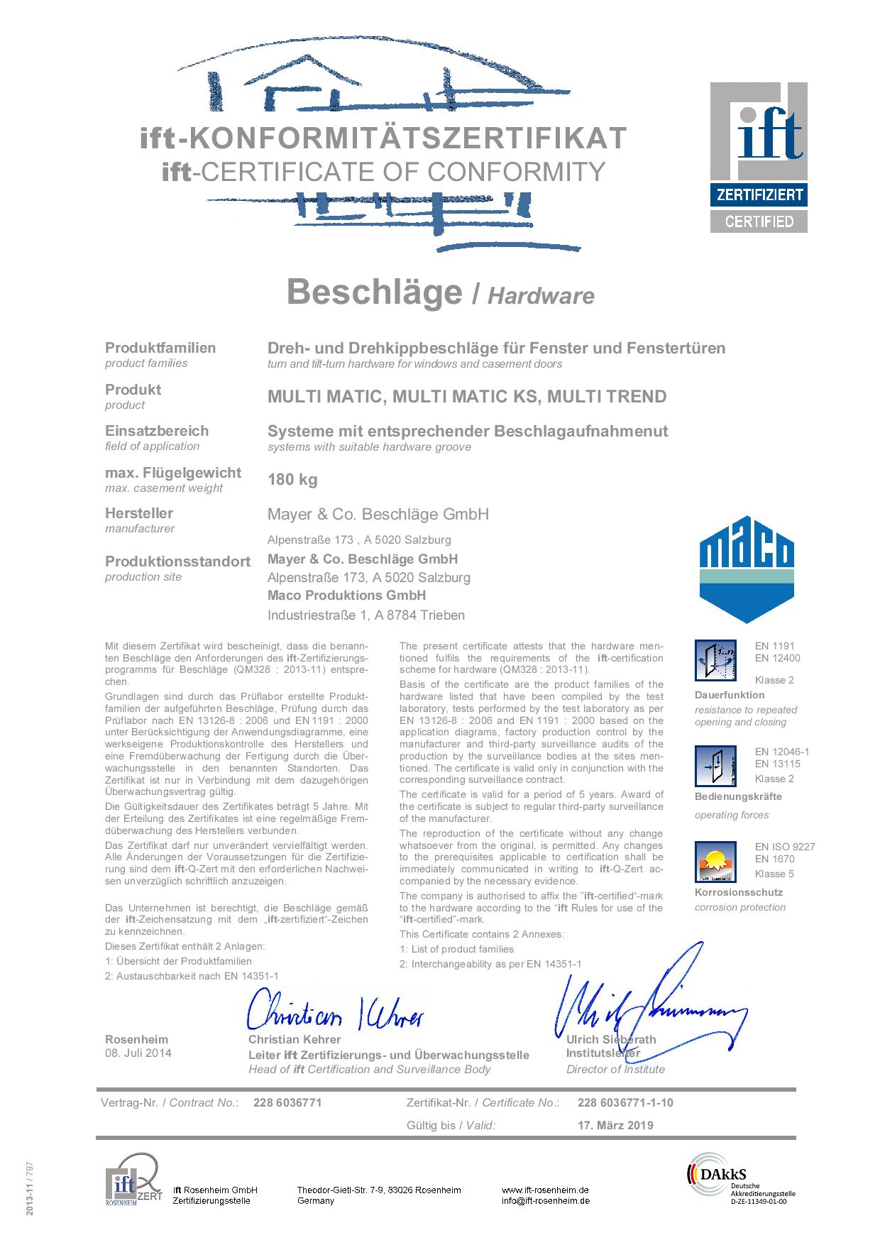 Furnitūra Maco MULTI-TREND ilgus gadus ir pierādījusi sevi kā uzticama verama un verami- atgāžama furnitūra priekš PVC un Koka logu sistēmām. Pirmkārt un galvenokārt kvalitāte, nevainojama funkcionalitāte, lielisks dizains un vienkārša modernizācija, par ko liecina 10 gadu garantija no piegādes datuma.